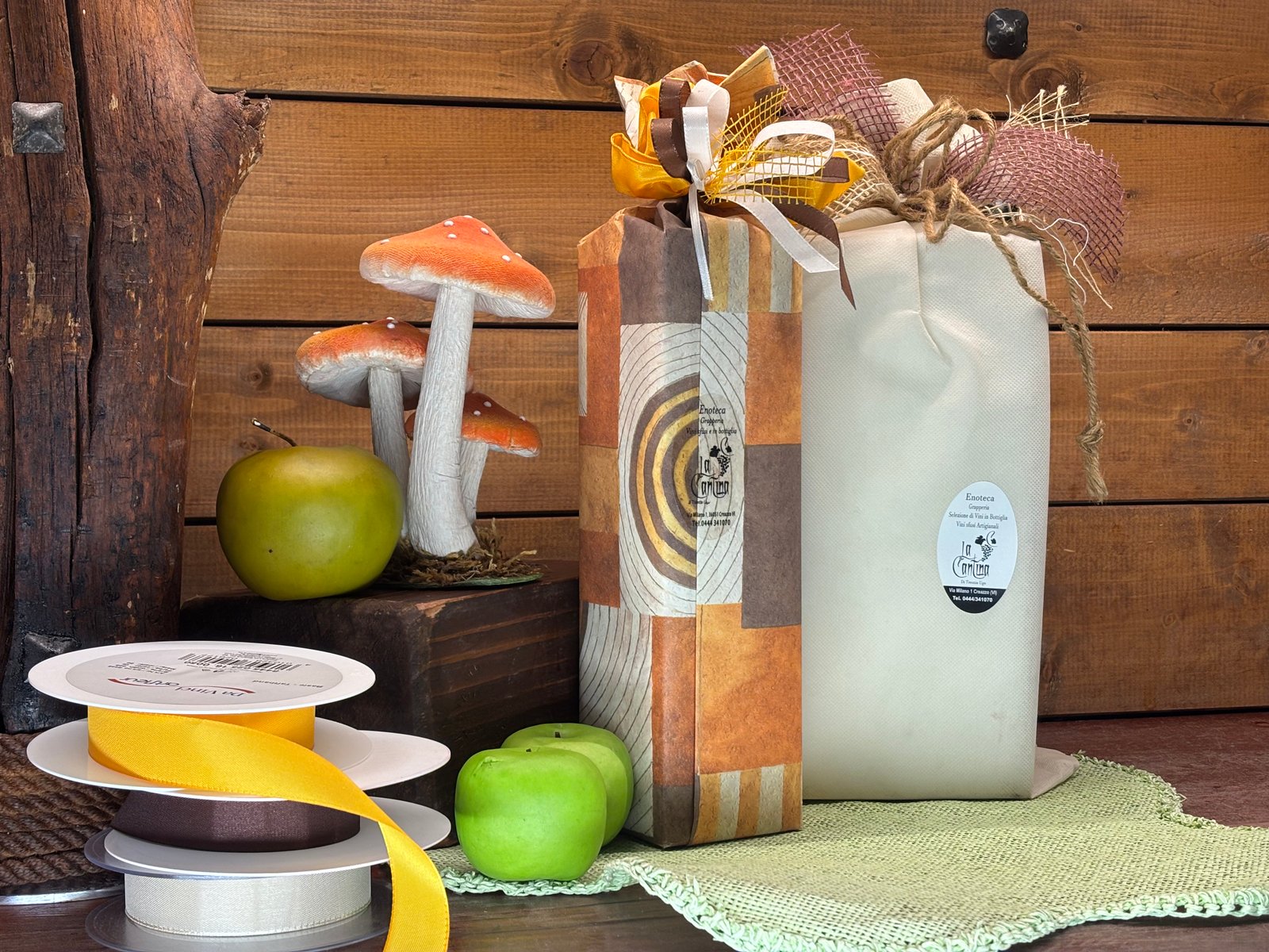 Tutte le nostre confezioni sono fatte a mano, prepariamo i fiocchi al momento cercando l’abbinamento migliore per il tuo regalo, ti aiutiamo a scegliere i prodotti perfetti per fare un’ottima figura, che si tratti di prodotti alimentari o di bottiglie di vino o distillati.